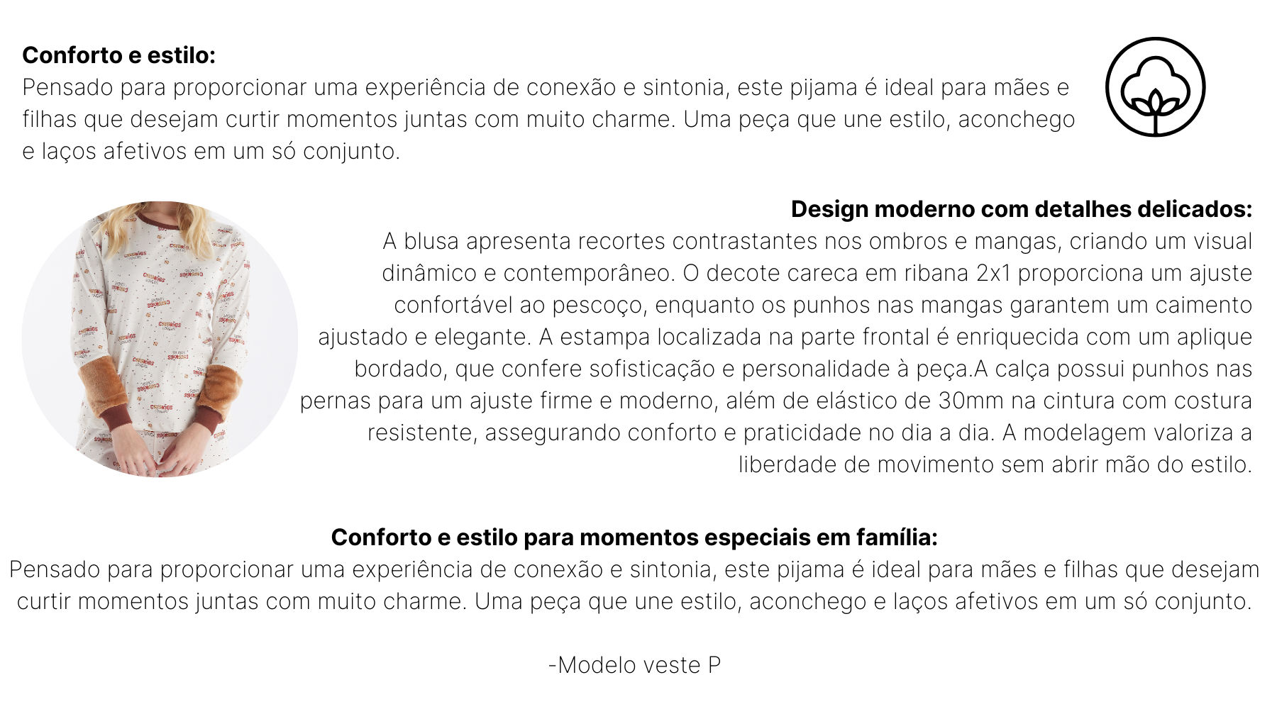 Julia, obrigada por compartilhar sua experiência 🌷 Ficamos felizes que tenha gostado do conforto do pijama, e sentimos muito pela questão da modelagem. Nossa equipe está à disposição para te ajudar a encontrar o tamanho ideal 💛