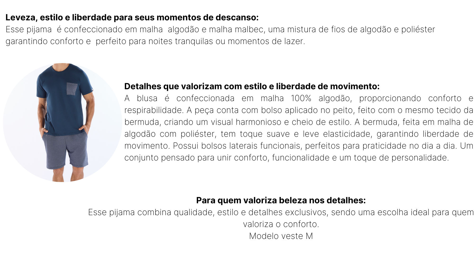 | Composição | Blusa: 100% Algodão Bermuda: 63,5% Algodão 36,5% Poliéster (MALHA MALBEC) |
