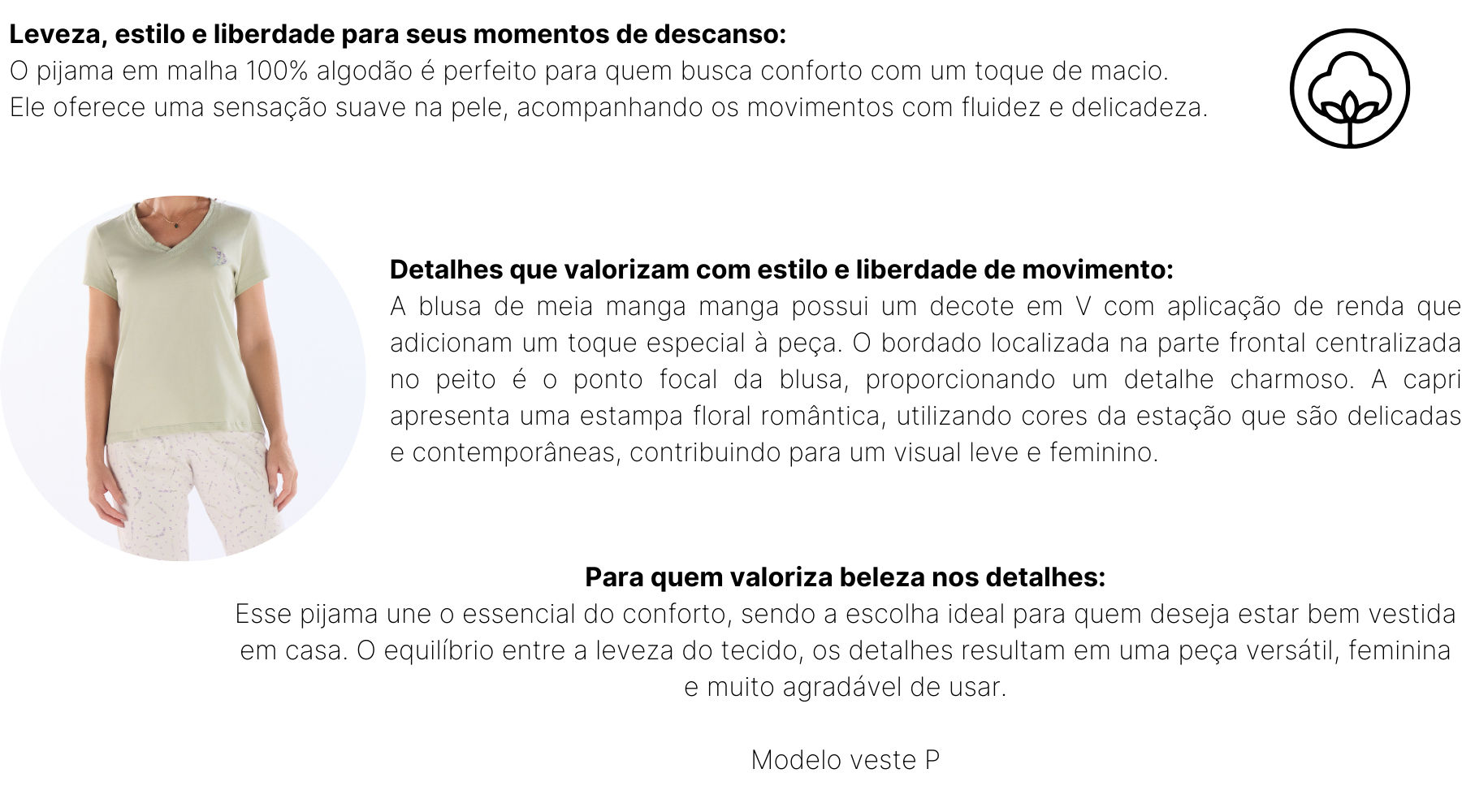PIJAMA MEIA MANGA EM MEIA MALHA COM CAPRI EM MALHA ROTATIVA FEMININO
