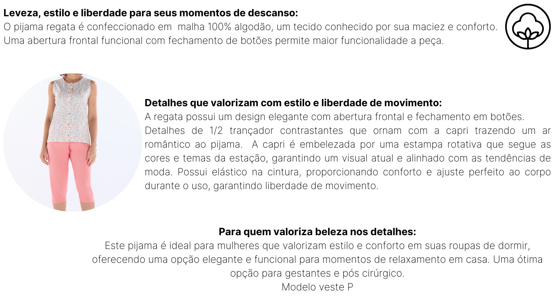 PIJAMA REGATA ABERTURA FRONTAL EM MALHA ROTATIVA COM CAPRI EM MEIA MALHA FEMININO